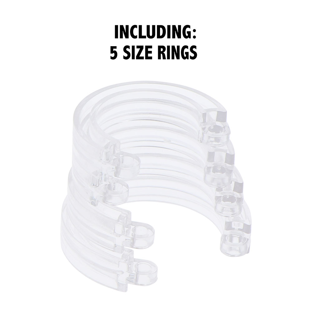 V setu prejmete cage, pet obročev različnih velikosti, da lahko izberete tistega, ki vam popolnoma ustreza, ter ključavnice. Kovinska ključavnica prihaja s parom ključev, priloženih pa je tudi 5 plastičnih vezic, ki jih lahko odstranite tako, da jih prerežete s škarjami. So oštevilčene, tako da je jasno, če so bile zamenjane brez dovoljenja.